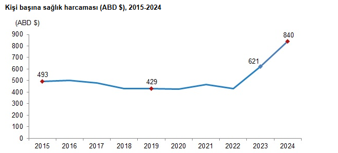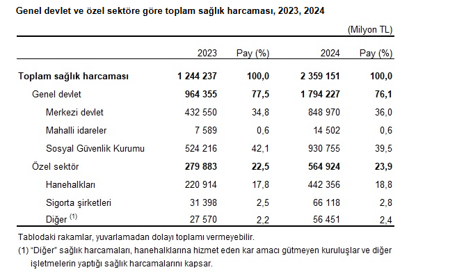 Toplam sağlık harcaması 2024 yılında bir önceki yıla göre %89,6 artarak 2 trilyon 359 milyar 151 milyon TL’ye yükseldi. Genel devlet sağlık harcaması %86,1 artarak 1 trilyon 794 milyar 227 milyon TL’ye ulaştı. Özel sektör sağlık harcaması ise %101,8’lik bir artış oranı ile 564 milyar 924 milyon TL olarak tahmin edildi.
