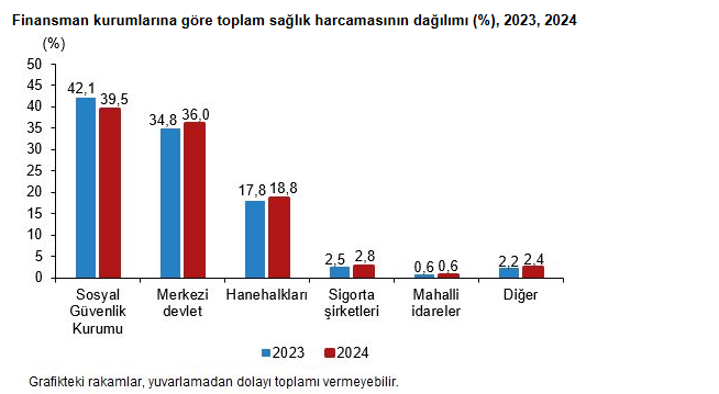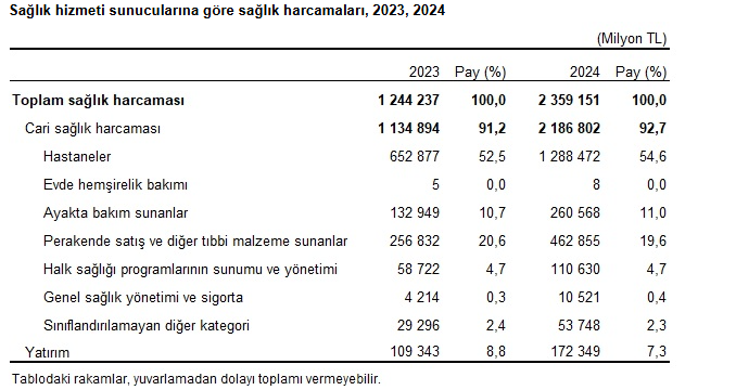 Toplam sağlık harcamasının sağlık hizmeti sunucularına göre dağılımı incelendiğinde, ilk üç sıra 2024 yılında da değişmedi. Sağlık hizmetleri ve ürünleri satın almak için başvurulan sağlık kurumları içerisinde en büyük payı 2024 yılında %54,6 ile hastaneler oluşturdu. Hastaneleri sırasıyla %19,6 ile perakende satış ve diğer tıbbi malzeme sunanlar ve %11,0 ile ayakta bakım sunanlar izledi.