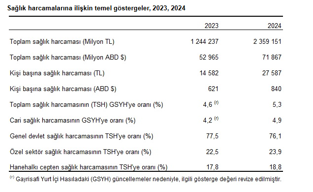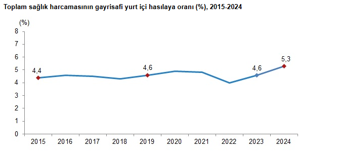Toplam sağlık harcamasının GSYH’ye oranı 2023 yılında %4,6 iken, 2024 yılında %5,3 oldu. Cari sağlık harcamasının GSYH’ye oranı 2023 yılında %4,2, 2024 yılında %4,9 olarak hesaplandı.