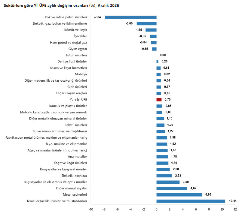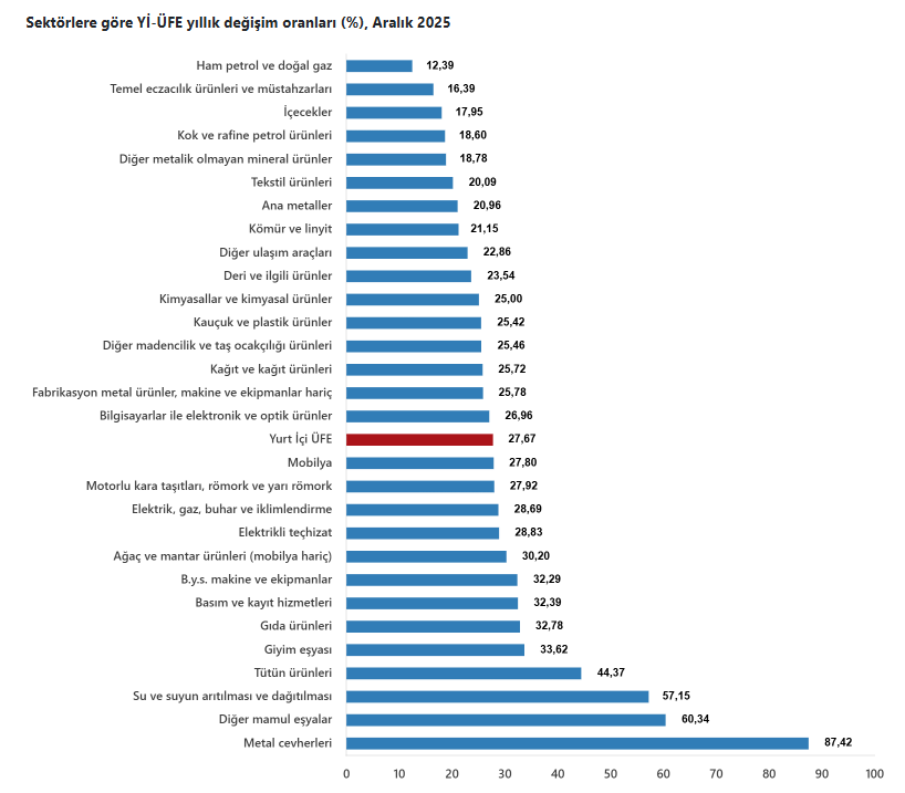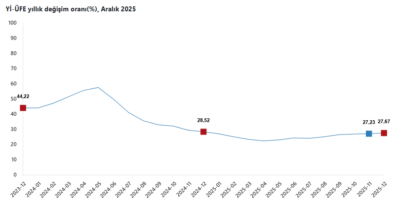 Yİ-ÜFE (2003=100) endeksi, 2025 yılı Aralık ayında bir önceki aya göre %0,75 artış gösterirken, geçen yılın aynı dönemine göre %27,67 ve on iki aylık ortalamalara göre ise %25,36 arttı.